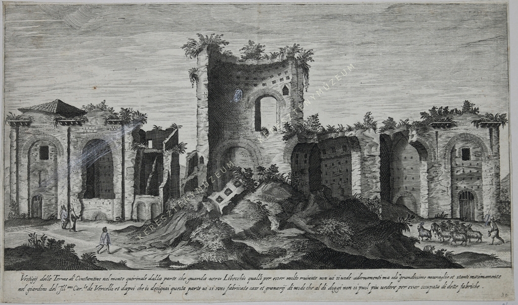 Vestigij delle Terme di Constantino nel monte quirinale dalla parte che guarda uerso Libecchio qualli per esser molto ruinate non ui si uede adornamenti ma solo grandissime muraglie et stanti masimamente nel giardino del Illmo Car.le de Vercello e dapoi che io designai questa parte ui si sono fabricate case et granarij di modo che al di doggi non si puol piu uedere per esser occupata di dette fabriche.