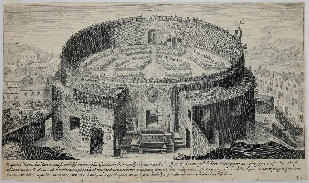 Vestigij del Mausoleo d' Augusto qual fu un bellisso sepolcro che lui edifico, doue uolse che si sepellissero i suoi descendenti e ui fu esso dopo la morte sepolto, lo chiamo Mausoleo per esser fatto come fugia il sepolcro che fu edificato a Mausoleo Redi Caria da Artemisia sua moglie, del quale non si uede altro che un muro di mattoni di forma circolare con dentro certe uolte et uicino a quello e un obelisco di granito rotto in piu pezzi per terra et un altro ui e sotto terra quali seruiuano per ornatnento (sic) di detto sepolcro oggidi sopra questo edificio ui e un bellisso giardino che serue alla casa di Sig.ri Soderini.