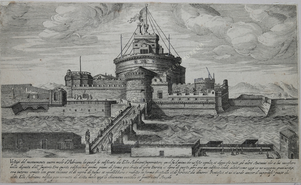 Vestigi del monumento ouero mole d'Adriano, la quale fu edificata da Elia Adriano Imperatore, qual fu il primo che ui fosse sepolto, et doppo esso tutti gli altri Antonini che a lui successero nella dignita dell Imperio Era questo edificio nel primo piano di forma quadrata di opra Dorica, et sopra di questo giro era un' edificio tondo altiss.o come oggi se ne ueggono gran uestigi, era intorno oranto con gran colonne et di sopra di statue et caualli. Hora e' ridotto in forma di castello et di fortezza da diuersi Pontefici et ui si uede ancor il superbiss.o ponte che detto Elio Adriano edifico per seruitio di detta mole oggi li chiamano castello e ponte sant' Angelo.