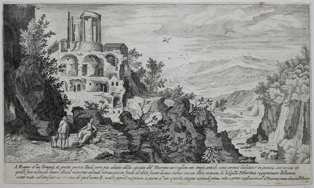 A. Rouine d'un Tempio, et grotta presso Tiuoli pero piu abasso della cascata del Teuerone oue vogliono nei tempi antichi come prima habitasse in questa, cosi poscia in quello fosse colta con honori diuini massime essendo ritrouata in fondo di detto fiume la sua statua con un libro in mano, la Sybilla Tiburtina cognominata Albunea, come nata ad una fonte iui uicina di quel nome. B. valle peril cui piano a guisa d'un quieto stagno uscendo prima sotto a gran scogli ua errando il Teuerone, insino sbocci nello Teuere.
