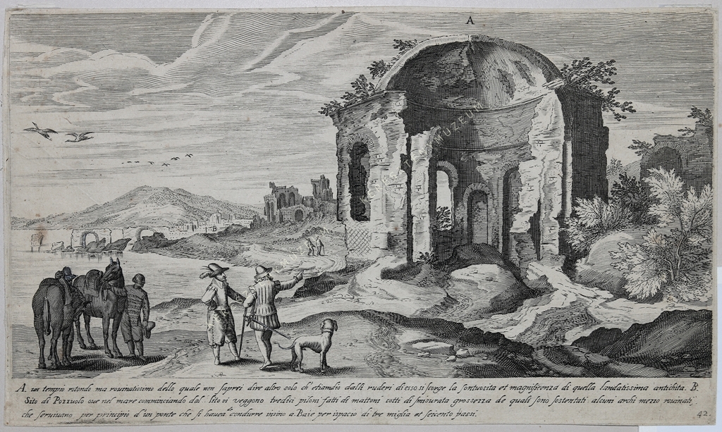 A. un tempio rotondo ma rouinatissimo dello quale non saprei dire altro solo ch' etiamdio dalli ruderi di esso si scorge la sontuosita et magnificenza di quella laudatissima antichita. B. Sito di Pozzuolo oue nel mare comminciando dal lito si ueggono tredici piloni fatti di mattoni cotti di smisurata grossezza de quali sono sostentati alcuni archi mezzo rouinati, che seruiuano per principio d'un ponte che si hauea de condurre insino a Baie per ispacio di tre miglia et seicento passi.