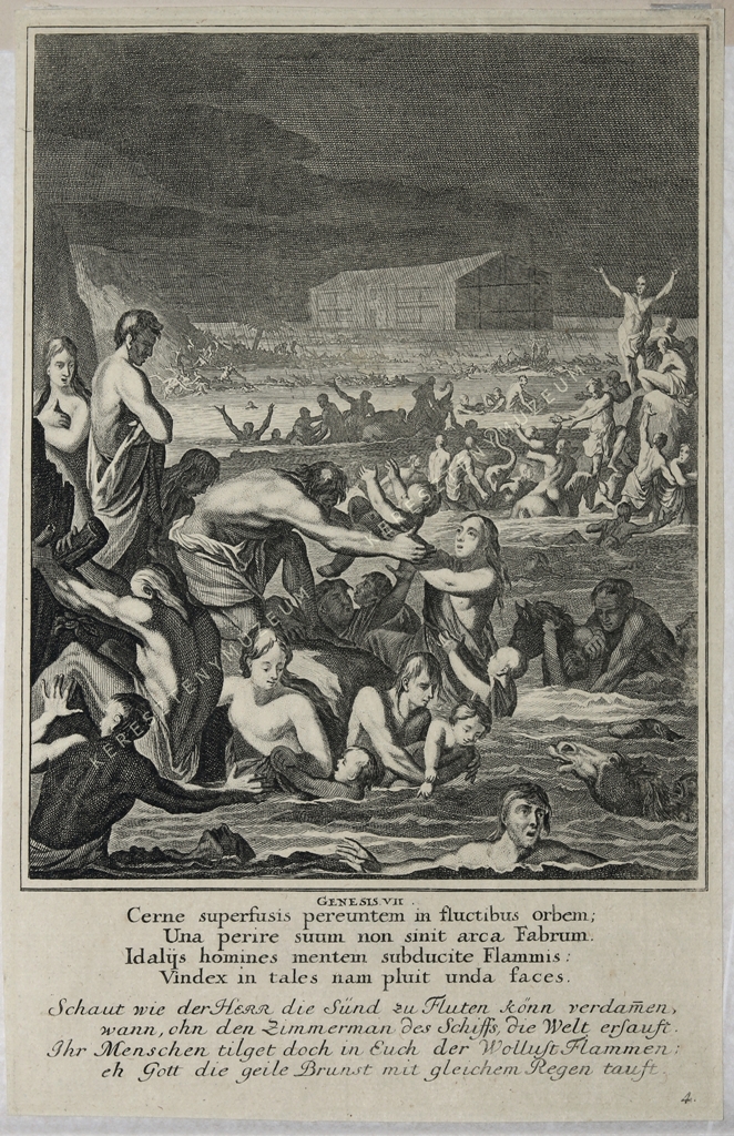 GENESIS VII. Cerne superfusis pereuntem in fluctibus orbem: / Una perire suum non sinit arca Fabrum. / Idalzs homines mentem subducite Flammis: / Vindex in tales nam pluit unda faces. // Schaut wie der HERR die Sünd zu Fluten könn verdam(m)en, / wann, ohn den Zimmermann des Schiffs, die Welt ersauft. / Ihr menschen tilget doch in Euch der Wollust Flammen: / eh Gott die geile Brunst mit gleichem Regen tauft.
