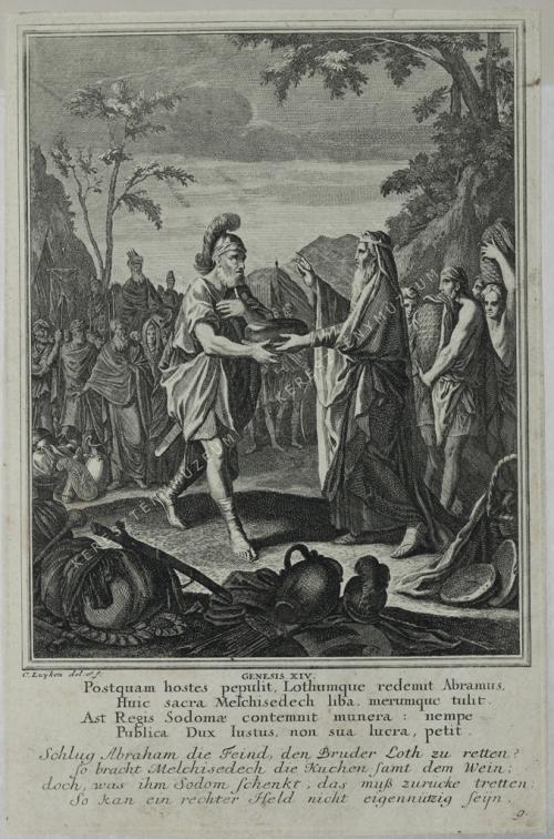 GENESIS XIV. Postquam hostes pepulit, Lothumque redemit Abramus, / Huic sacra Melchisedech liba, merumque tulit. / Ast Regis Sodomae contemnit munera: nempe / Publica Dux Iustus, non sua lucra, petit. // Schlug Abraham die Feind, den Bruder Loth zu retten? / So bracht Melchisedech die Kuchen samt dem Wein; / doch, was ihm Sodom schenkt, das muß zurücke tretten: / So kan ein rechter Held nicht eigennutzig seyn.