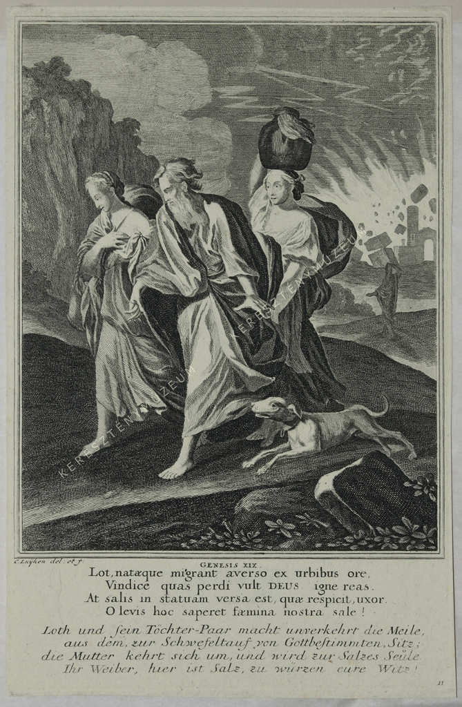 GENESIS XIX. Lot, nataeque migrant averso ex urbibus ore, / Vindice quas perdi vult DEUS igne reas. / At salis in statuam versa est, quae respicit, uxor. / O levis hoc saperet faemina nostra sale! // Loth und sein Töchter-Paar macht unverkehrt die Meile / aus dem, zur Schwefeltauf von Gottbestimmten, Sitz; / die Mutter kehrt sich um, und wird zur Salzes Seüle / Ihr Weiber, hier ist Salz, zu würzen eure Witz!