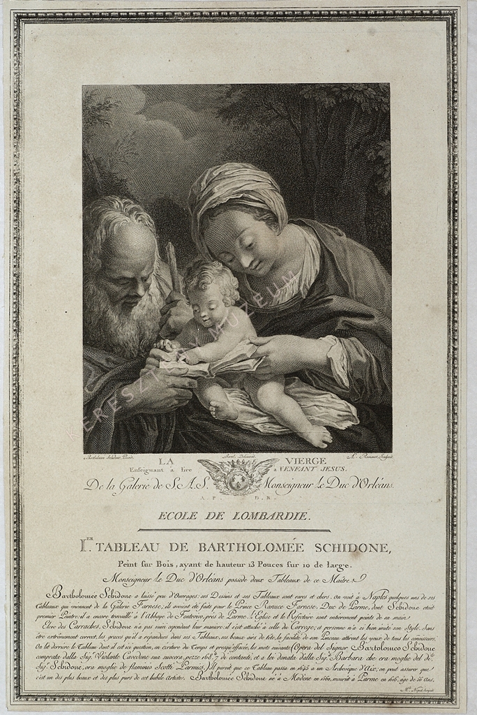 La Vierge enseignant a lire a l'Enfant Jesus. De la Galerie de S.A.S. Monseigneur le Duc d'Orléans. École de Lombardie. Ier Tableau de Bartholomée Schidone, Peint sur Bois, ayant de hauteur 13 Pouces sur 10 de large. […] Bartholomée Schidone né à Modène en 1560, mourût à Parme en 1616, âge de 56 ans.
