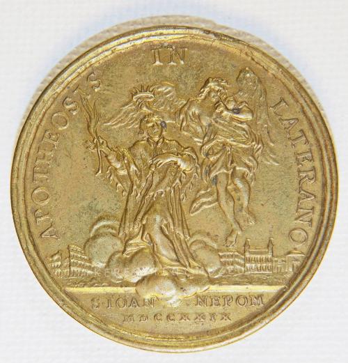 a megdicsőült szent felhőkön emelkedik a mennybe, feje fölé angyal tart koronát. mögötte Prága palotái és a hullámzó Moldva.