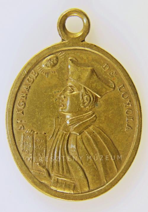 balra néző biretumos pap, felette a napkorong, benne IHS-jel; kezében a szabálykönyv; körirat: ST. IGNACE DE LOYOLA