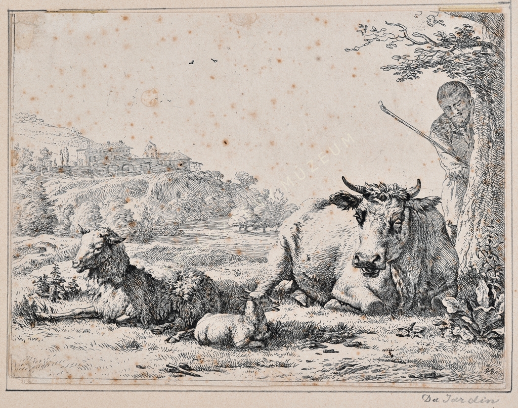 Tájkép pihenő tehénnel és juhokkal