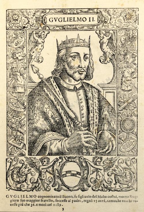 GUGLIELMO II. Gvglielmo cognominato il Buono, su figliuolo del Malo: costui, morto Ruggiero, suo maggior fratello, successe al padre, regno 25 anni, comeche non se visse piu che 36, e mori nel 1189.