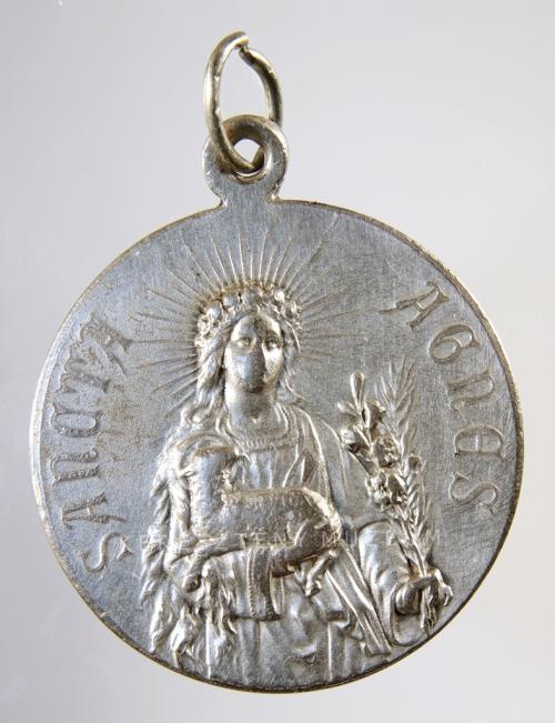 Szent nőalak háromnegyed alakos ábrázolása, karjában attributumként bárány, kezében pálmaág és liliom ág;