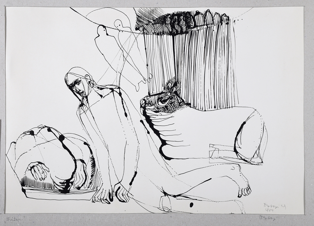 Térde rogyott fiatal férfi alakja, előtte földre borult ember, mögötte fekvő állat (oroszlán?). A háttérben függöny mögött két sétáló alak körvonala.