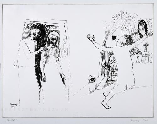 Balról ajtó előtt álló férfi, kezét az előtte álló nő jobb vállára teszi. Jobbról térdre borult, kezeit széttáró alak, mögötte keresztút stációkkal.