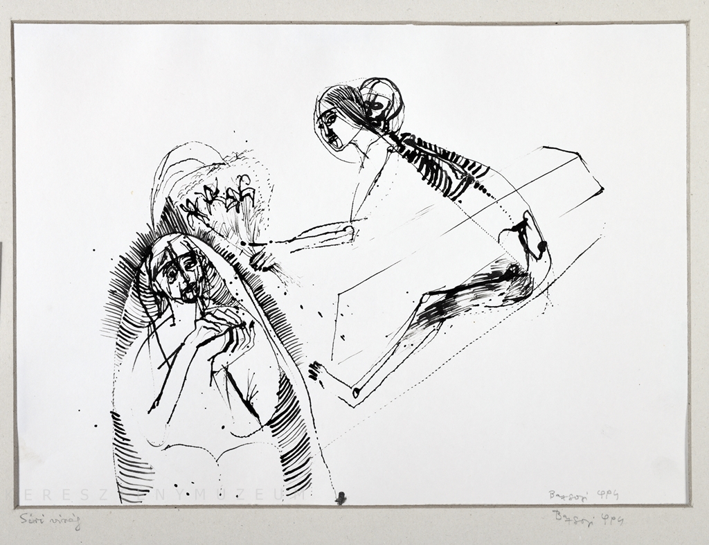Koporsó előtt ülő, sugárkoszorús nőalak, előtte a koporsóból felülő fiatal lány, neki virágcsokrot nyújt át.