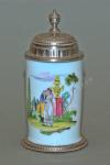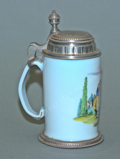 A hengeres testet C-füllel látták el, talpa és fedele öntött ónlemez. Palástján festett idillikus jelenet