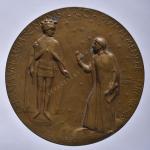 Áldozati oltár, melyre Hungária, mint a magyar nemzetet megjelenítő nőalak helyez el babérágat.