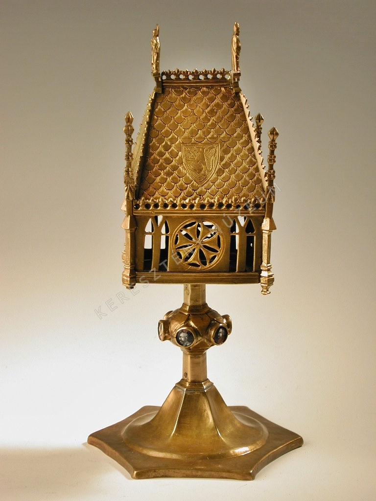 Hatkaréjos talpon álló, gótikus házikó-formájú tárgy. Négy sarkán felnyúló, öntött oszlopok, tetőgerincet két öntött szobor zárja: egy férfi-szent, és egy püspök. Oldalt elforgatható kapocs zárja a zsanéron felnyíló, sátortetős fedelet. A vésett, halpikkelyes fedél egyik oldalán, pajzsban ágaskodó farkas(?), másikon, gyűrűben angyali üdvözlet. A noduson hat zománc kép.