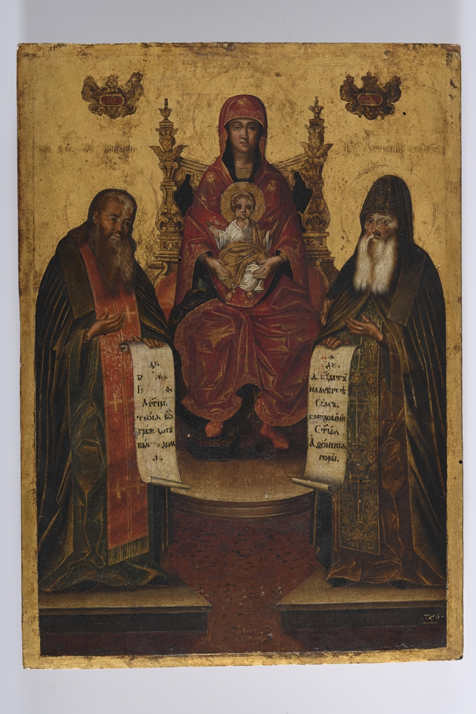 Orosz festő Trónoló Istenszülő Szt. Feodoszij és Szt. Antonyij szerzetesekkel