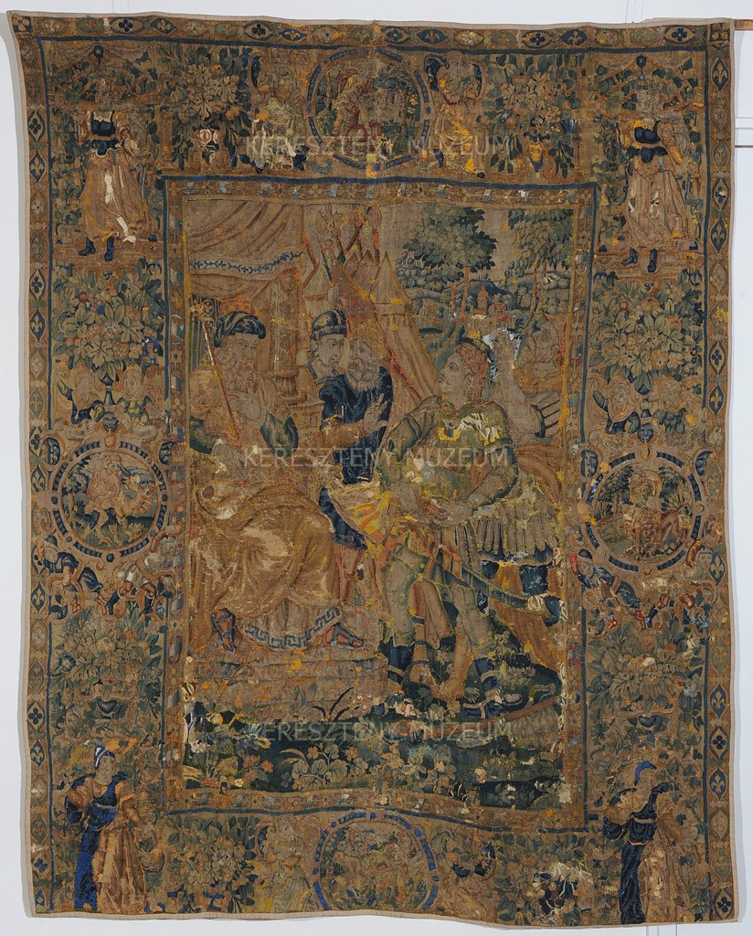 Az ajándékozási jelenetet ábrázoló kárpit igen rossz állapotban van, több helyen szakadt, erősen kopott, hiányos. A kép bal szélén trónuson ülő alak látható jogarral a kezében. Mellette két férfi áll. A trónoló alak előtt két katona ajándékokat nyújt át. A háttérben sátrak sorakoznak - mintha egy csatamezőn, vagy egy hadsereg táborában játszódna a jelenet. A kárpit bordűrje igen széles, négy sarkában álló alakok. A négy medallionban Herkules tettei.