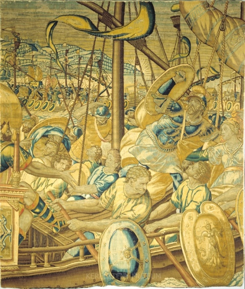 A kárpiton szereplő személyek a római hadvezér, Antonius és az egyiptomi fáraónő, Kleopátra. Együttes hajóhadukat Antonius riválisa, Octavianus, a későbbi Augusztus császár, Kr.e. 44-ben szétverte. Híres szerelmük a vesztes csata után Kleopátra mérges kígyó általi öngyilkosságával végződött. A kárpiton még egy hajóban ülnek hevesen evező hajósok közt. A Keresztény Múzeumban kárpitjai között ez a legfinomabb szövésű. Az Ipolyi-gyűjteményből származik.