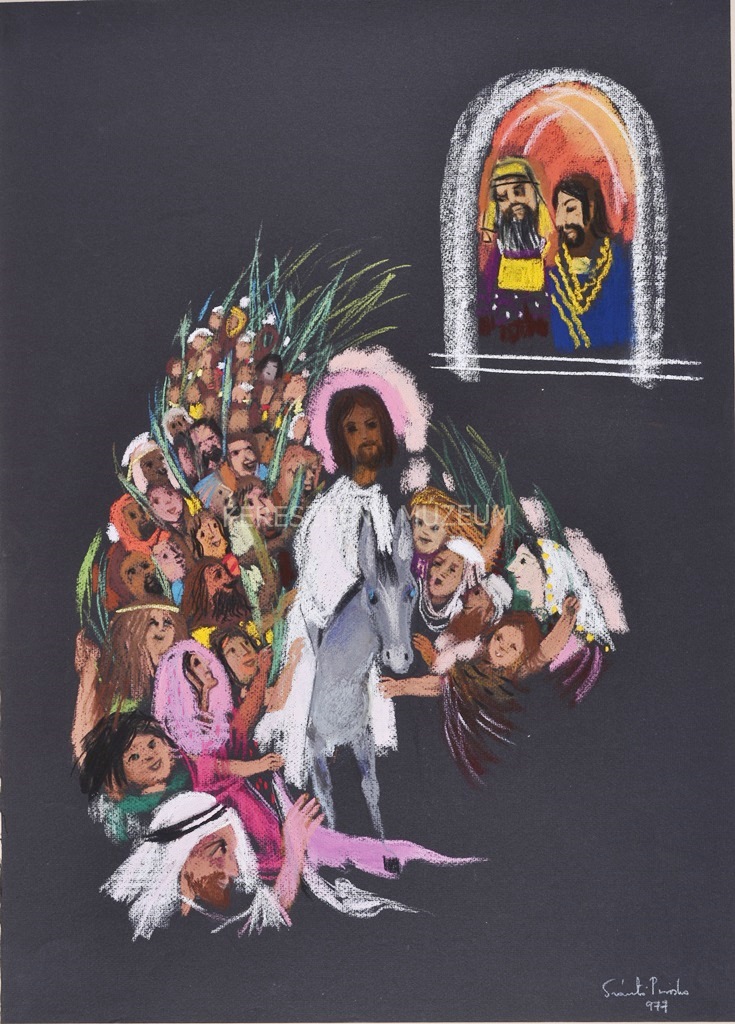 Jeruzsálem felé közeledve Jézus elküldte két tanítványát Bethaniába, hogy hozzanak onnan egy szamarat és annak az első fajzását, amin még nem ült senki, hogy beteljesítse a próféta jövendölését: „Eljő az Úr, szamárháton ül és egy nőstény szamár vemhén" - s a szelíd jószágon ülve, boldogan kiáltozó sokaságtól kísérve, vonult be Jeruzsálembe. Pálmaágakat lengetve, hozsannázva kísérte Jézust ujjongó örömmel a benne hívők serege, férfiak, asszonyok, öregek és ifjak. Felsőruhájukat terítették elé az út porába, zöld gallyakat és virágzó ágakat vágtak, hogy megvédjék a nap hevétől és szüntelenül kiáltozták: