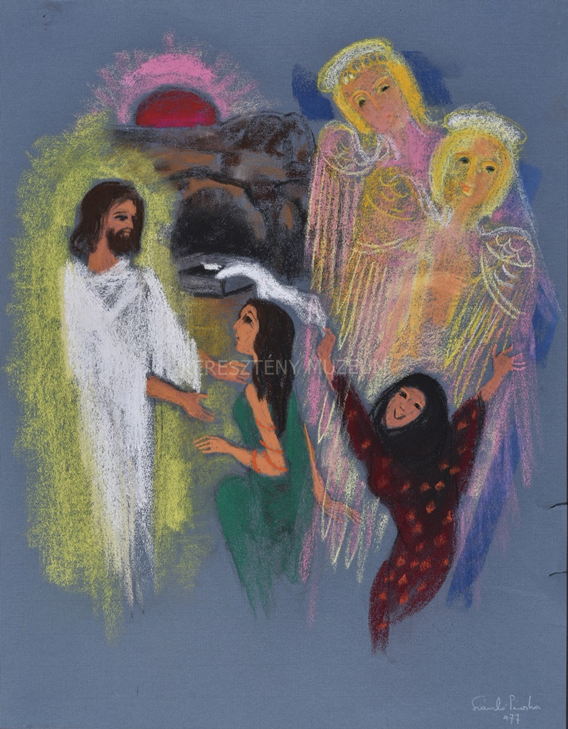 Kora reggel odament a sziklasírhoz Mária Magdolna, de a követ elhengerítve találta s a sírt üresen. Elfutott Péterért és Jánosért, azok behajoltak a sírba s a halotti lepleket szétszórva találták, Jézus teste nem volt ott. Elmentek hát, hogy megmondják a többieknek, de Mária Magdolna ott maradt, siratva Jézust. És két angyalt látott ott ülni, ahol Jézus teste feküdt volt. És az egyik azt kérdezte tőle: