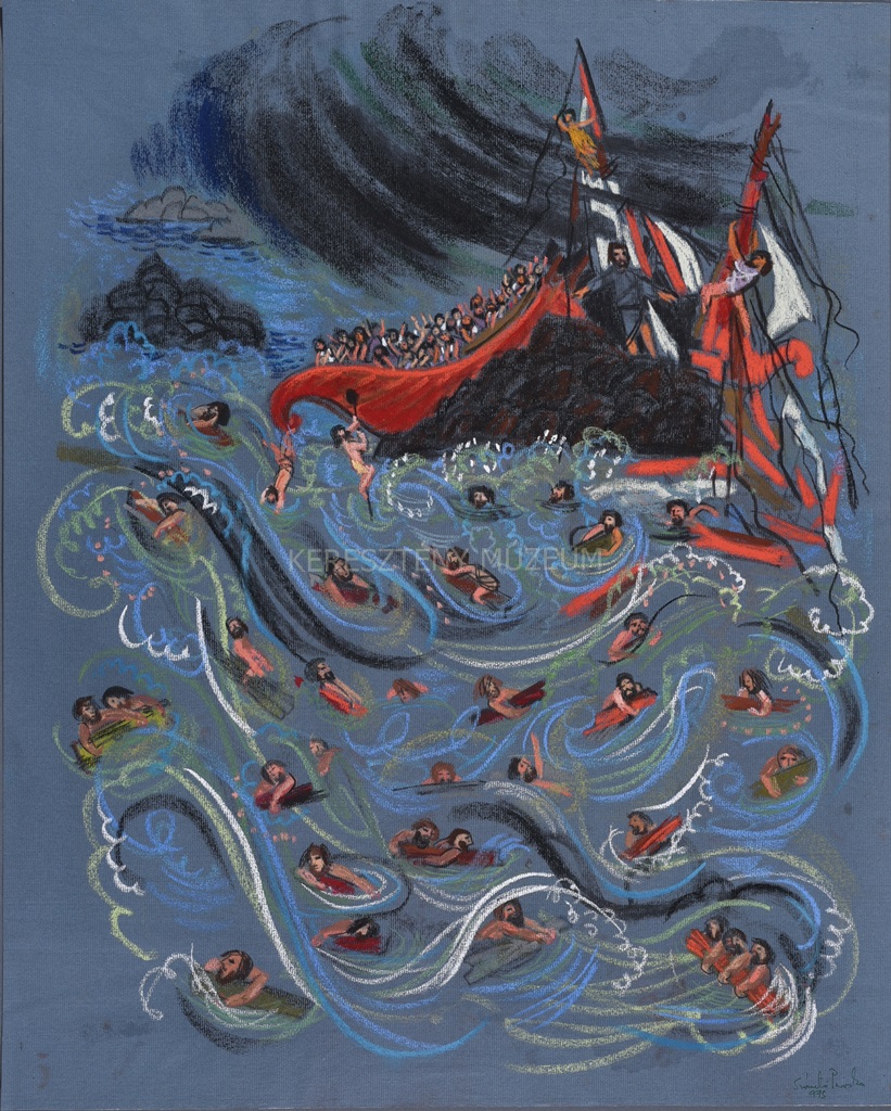 Agrippa, Júdea akkori helytartója, Pált más foglyokkal együtt Rómába küldte. „A császárra apelláltál, a császárhoz fogsz menni." Egy Juliusz nevű férfi volt a hajó parancsnoka s volt a hajóján a hajósokkal, foglyokkal és utasokkal együtt kétszáz ember, de a tenger, a zátonyok s a dühöngő szél minden ereje elpusztítani igyekezett őket. Kréta szigete előtt olyan szörnyű erővel támadt a vihar, hogy Pál tanácsára meg kellett volna szakítaniok az utat, de a parancsnok jobban hitt a kormányosnak s folytatta futását a hajó, gyönge tojáshéj módjára ropogva és rázkódva. Kétségbeesés fogta el az embereket s már a foglyokat akarták a vízbe ölni, hogy könnyítsenek a hajó terhén. De Pál így szólt: