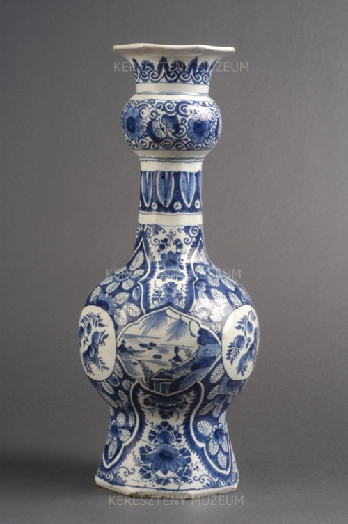 A kerámiák között legjelentősebb gyűjteményegységünket a kínai porcelánok mellett a delfti fajanszok jelentik. Máig csodálatra méltó a kis holland műhelyek aktivitása, ahogyan szinte egész Európát elárasztották ragyogó kékfestésű mázas kerámiáikkal. Portékáiknak egyik tipikus példája ez a magas nyakú, stilizált virágokkal és kínai hatást mutató zsánerjelenetekkel díszített váza.