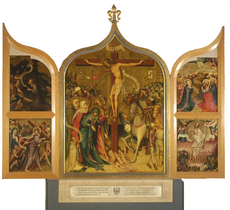 A magyarországi szárnyasoltár-festészet egyik legszebb darabja a garamszentbenedeki bencés apátsági templom egyik mellékoltárára készült. A 19. században elégett, de másolatban fennmaradt predella latin nyelvű felirata tartalmazza a készítés évét, és megnevezi a keresztfa tövében térdelve imádkozó donátort, Petösfia Miklóst, győri kanonokot, a budai várkápolna kántorát, aki a Thomas de Coloswarnak nevezett festőt az oltárkép megfestésével megbízta. A kiemelkedő színvonalú alkotó a közép-európai ún. internacionális gótika kései, összefoglaló jellegű, de önálló, egyéni formanyelvét megtaláló mestere. Mindenek előtt a kortárs cseh táblakép festészethez és a kódexfestészethez való kötődése mutatható ki. Olyan új problémakör is foglalkoztatja, mint a perspektivikus ábrázolás és az arcok portrészerű megjelenítése. Luxemburgi Zsigmond magyar király (1387-1437) és német-római császár udvari művészeti köréhez tartozhatott, akit itt elegáns lovagként, a Kereszt alatt jobbra látható római százados képében meg is jelenített. A mozgatható szárnyak belső oldalán a szenvedéstörténet jelenetei közül az Olajfák hegye, a Keresztvitel, a Feltámadás és a Mennybemenetel látható. Csukott állapotában négy szent életét állította példázatként a megrendelő a szerzetesek és hívek elé. Szent Benedek, Szent Egyed, Szent Miklós legendájának csodás elemei mind utalások az Oltáriszentség titkára, benne Jézus Krisztus keresztáldozatára. A negyedik külső kép elveszett. Az oltár 1872 körül, az apátsági templom neogótikus felújítása előtt, eredeti kerete nélkül, szétszedett állapotban került Simor János érsek képtárába.
