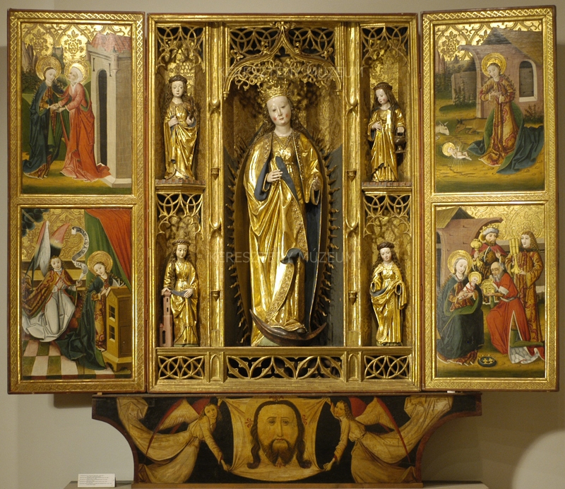 A szepességi Felka (ma Szlovákia, Velká) község templomából származik a Keresztény Múzeum egyetlen olyan szárnyasoltára, amely szerkezetében is megőrizte az eredeti, késő gótikus állapotot. Az 1480 körül készült oltár szekrényében teljesalakos Mária-alakot látunk Napsugár mandorla előtt, a Holdsarlóra lépve. A Jelenések könyvének napbaöltözött asszonyát azonosították Jézus anyjával, így az ábrázolások részletei is egybemosódhattak. A gyermek valaha ott ült anyja karján, ahogy ezt az asszony kéztartása jelzi. Mária körül a négy szoborfülkében női szenteket látunk: balra Alexandriai Szent Katalin és Szent Borbála, jobbra Szent Dorottya és Antiochiai Szent Margit. A szárnyak belső oldalán Mária életének örömteli jelenetei sorakoznak. A történet balra lent kezdődik az Angyali üdvözlettel, felette Mária és Erzsébet találkozása. Jobboldalt fent már Jézus születése tűnik fel, majd alatta a Három királyok imádása. Az ünnepi oldalak erőteljes színvilága, a gazdag aranyozás az ünnepi oldalt felemelővé, valóban mennyeivé varázsolja. A külső oldalakon az eredeti passiójelenetek elpusztultak. A szekrényszobrok alatt elhelyezkedő predellán két lebegő angyal tartja Veronika kendőjét Krisztus képmásával. Az oltár festője és szobrásza a Szmrecsányi főoltár mesterének nevezetett mester, kinek további tíz hasonló, a környékbeli települések templomai számára megrendelt Mária-oltára ismert.