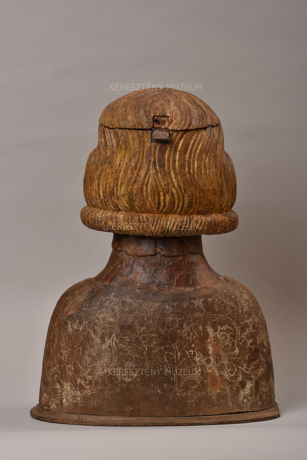 Körbefaragott, felnyitható fedelű ereklyetartó, amely négy különálló darabból áll (felnyitható fedél, fej és büszt, rács, talplemez). Láncingének és fegyverkabátjának felületén jó állapotú, poncolt díszítés, a fegyverkabáton filigrán indaminta. Minden bizonnyal azonos műhelyből származik a kölni Schnütgen múzeum A99-es leltári számú, ugyancsak lovagalakot formáló alkotásával.